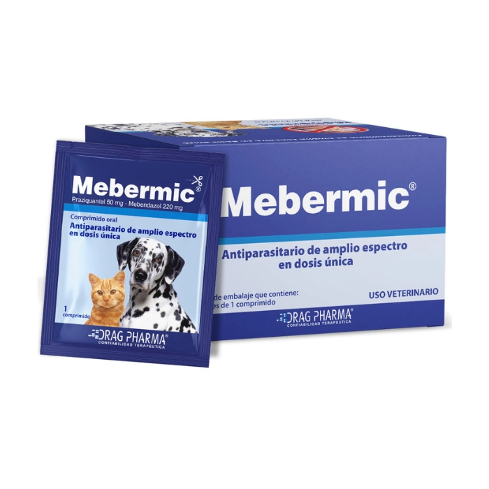 Mebermic es un antiparasitario oral de amplio espectro para perros y gatos, eficaz contra nematodos y cestodos. Su fórmula combina praziquantel y mebendazol, eliminando parásitos intestinales comunes.